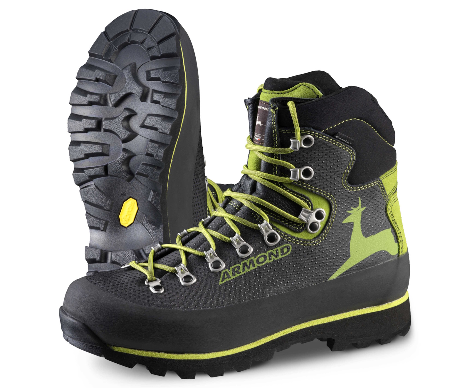 Minuteria in acciaio performante e leggera. Fodera in membrana Sympatex® impermeabile, traspirante ed ecologica. Bordo in gomma protettivo e suola Vibram con inserto in microporosa leggera.