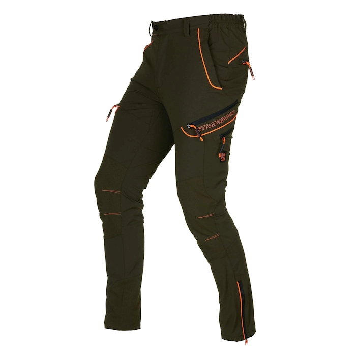 Pantalone da caccia elasticizzato dalla forma ergonomica e realizzato in nylon micro-ripstop leggero e comfortevole con rinforzi in tessuto GR-TEX nella parti soggette a maggior usura. Due tasche frontali a zip, doppia tasca laterale a zip, due tasche posteriori a zip, elastico sui fianchi, zip a fondo gamba.